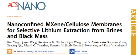 近日,我校诺奖得主联合实验室在利用二维材料从盐湖卤水与废旧锂电池中高效提取锂资源的研究中取得重大进展。相关成果以《Nanoconfined MXene/Cellulose Membranes for Selective Lithium Extraction from Brines and Black Mass》为题,发表于材料化学领域国际顶尖期刊《ACS Nano》。该论文第一作者为我校杨蔻副教授,快猫