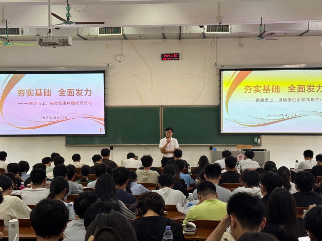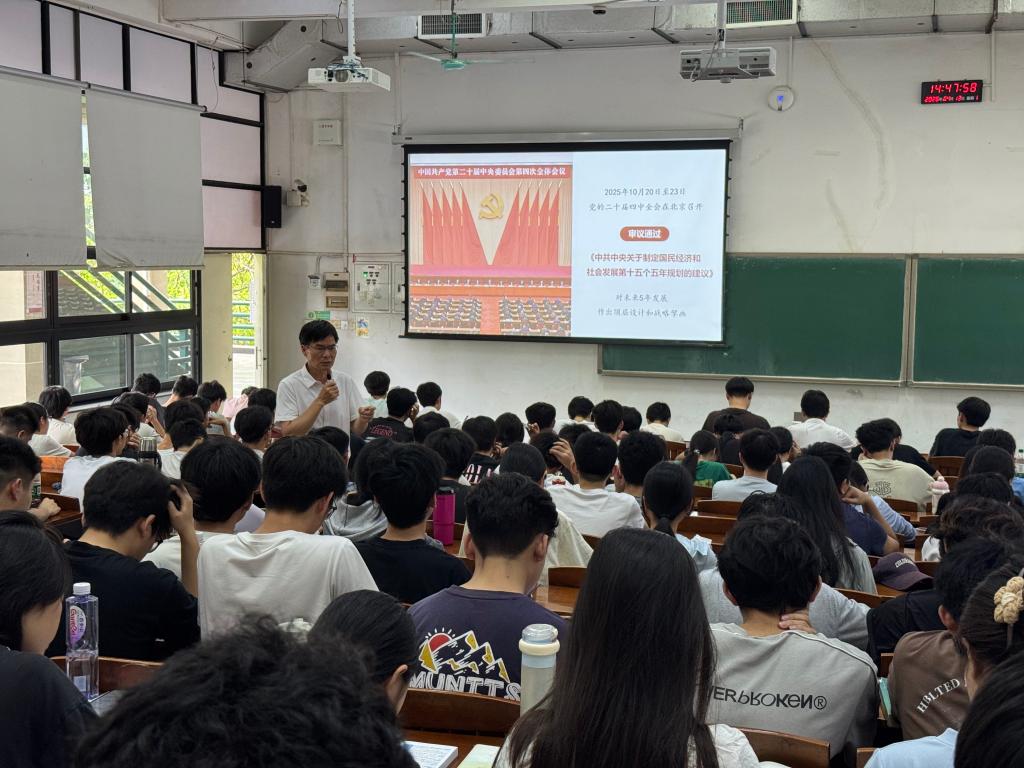 学科特色,阐释了学生在助力“冲一流”中的可为之处,强调个体的成长与学校的发展互为支撑、彼此成就。随后,他围绕“推进中国式现代化与‘十五五’规划”展开讲授,系统梳理了五年规划的历史沿革与制度优势,深入分析了当下面临的形势与挑战,并对规划的重点内容与战略布局进行了详细解读。